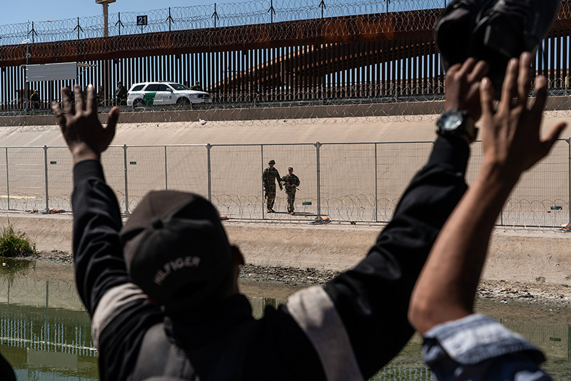 3. Asylum seekers look over towards the U.S. National Guardsmen from the Mexican side of the border in Juarez, Mexico, on march 29, 2023. Venezuelan asylum-seekers looking for refuge face a hard border.