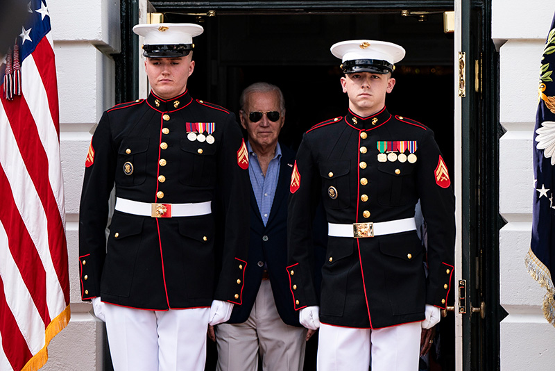 4. Marines stand by as President Joe Biden arrives to host a barbecue with active-duty military families on the South Lawn at the White House on Tuesday, July 4, 2023.
