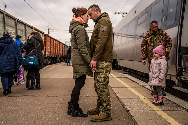 9. Ukrainian soldier Oleksandr, 37, says goodbye to his wife, Yana, 31, and daughter Ivanna, 5, in Kramatorsk, Ukraine, on March 10, 2023. They came to visit him for 10 days in Kramatorsk, a strategic hub that lies directly west of Bakhmut.