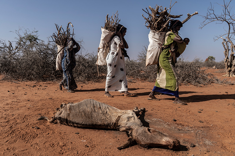 1. Displaced Somali women carry firewood past a donkey carcass in the scrubland near Doolow, Somalia on Jan. 12, 2023. The worst drought in four decades is imperiling lives across the Horn of Africa.