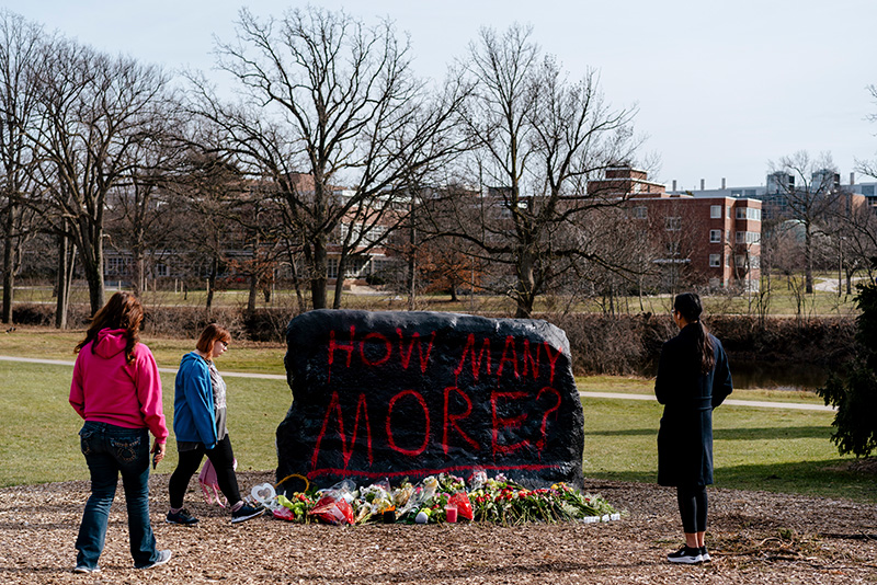 8. Flowers are left at the base of the Rock, a stone traditionally painted almost daily by students at Michigan State, that reads "How Many More?" following a mass shooting on the campus in East Lansing, Mich., Feb. 14, 2023. A gunman killed three people and wounded five others at Michigan State University.